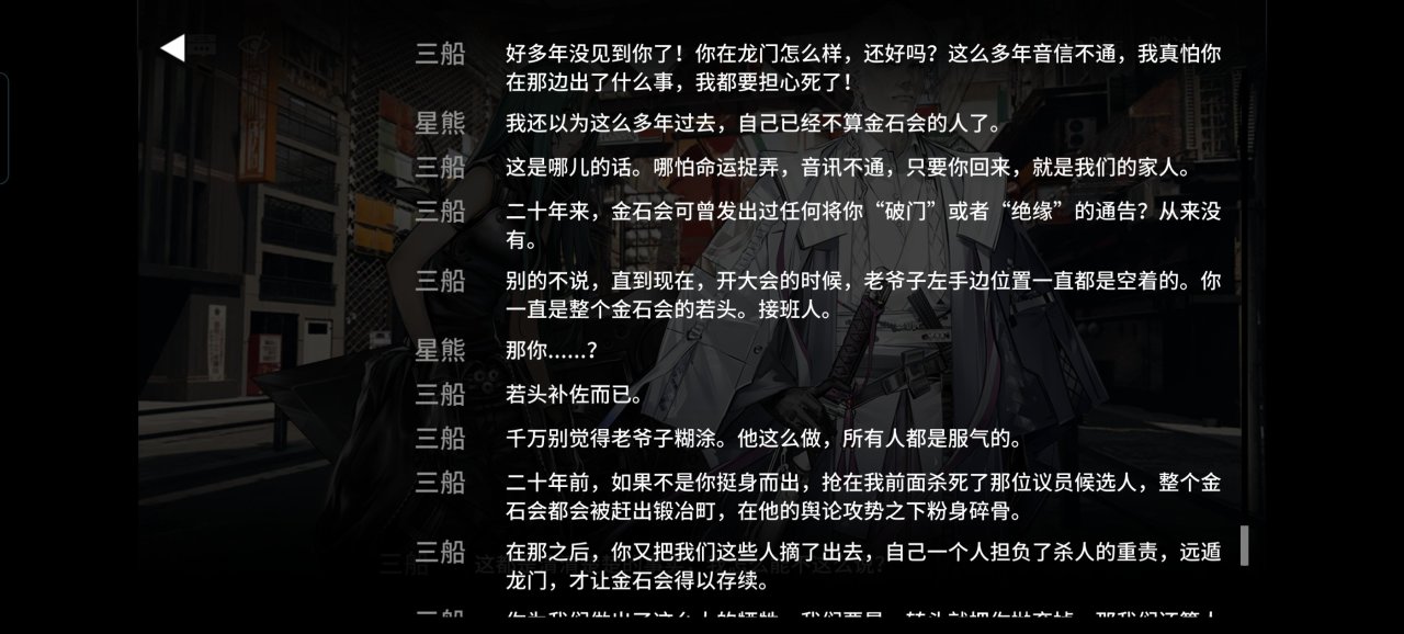 多年前的夜晚,有位議員對幫會步步緊逼,基本要置星熊所在的幫會於死地。而星熊得知有金兵衛要謀殺城市的議員(這種黑幫參與政治的謀殺會更市民更加厭惡幫會),本是爲了保護這位議員的星熊在種族天賦暴走後卻看到了議員的屍體,當時在場的人只有金兵衛和星熊。而幫派成員干涉政治是不得了的事情,爲了這件事幫會支付了極大的代價,再加上內部爲了繼承人的問題導致的互相傾軋,星熊不得已出走龍門20年。(我確實沒看出來到底是金兵衛還是星熊殺死的議員,感覺都不太對)