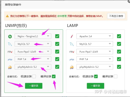 登入寶塔面板,面板會自動推薦安裝環境套件,這裏有兩種選擇,第一種是 LNMP (Linux+Nginx+MySQL+PHP)套件,第二種是 LAMP (Linux+Apache+MySQL+PHP)套件,二者選一安裝即可。