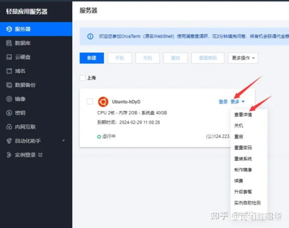 點擊更多選項,彈出來的菜單中點擊查看詳情,就可以看到你雲服務器的一些管理情況,使用情況、資源佔用情況、費用到期情況等。