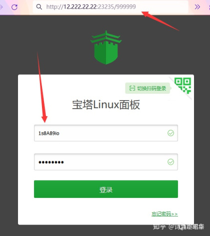上圖爲防火牆內加上寶塔控制面板端口後的情況,現在我們在瀏覽器輸入外網地址: http://12.222.22.22:23235/999999,和用戶名: 1s8A89io 密碼: 12368799 ,即可訪問我們的服務器,請不要把面板地址隨意告訴他人。