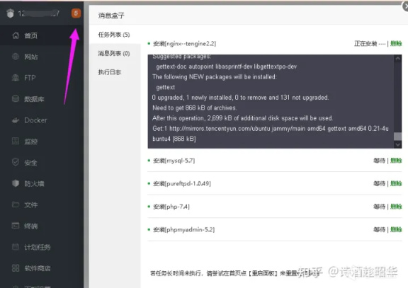接下來我們點擊左上角的紅色框,就可以看到環境的下載進度 ,等待環境下載安裝完成,一般會持續10分鐘到半小時,根據你服務器的性能決定。