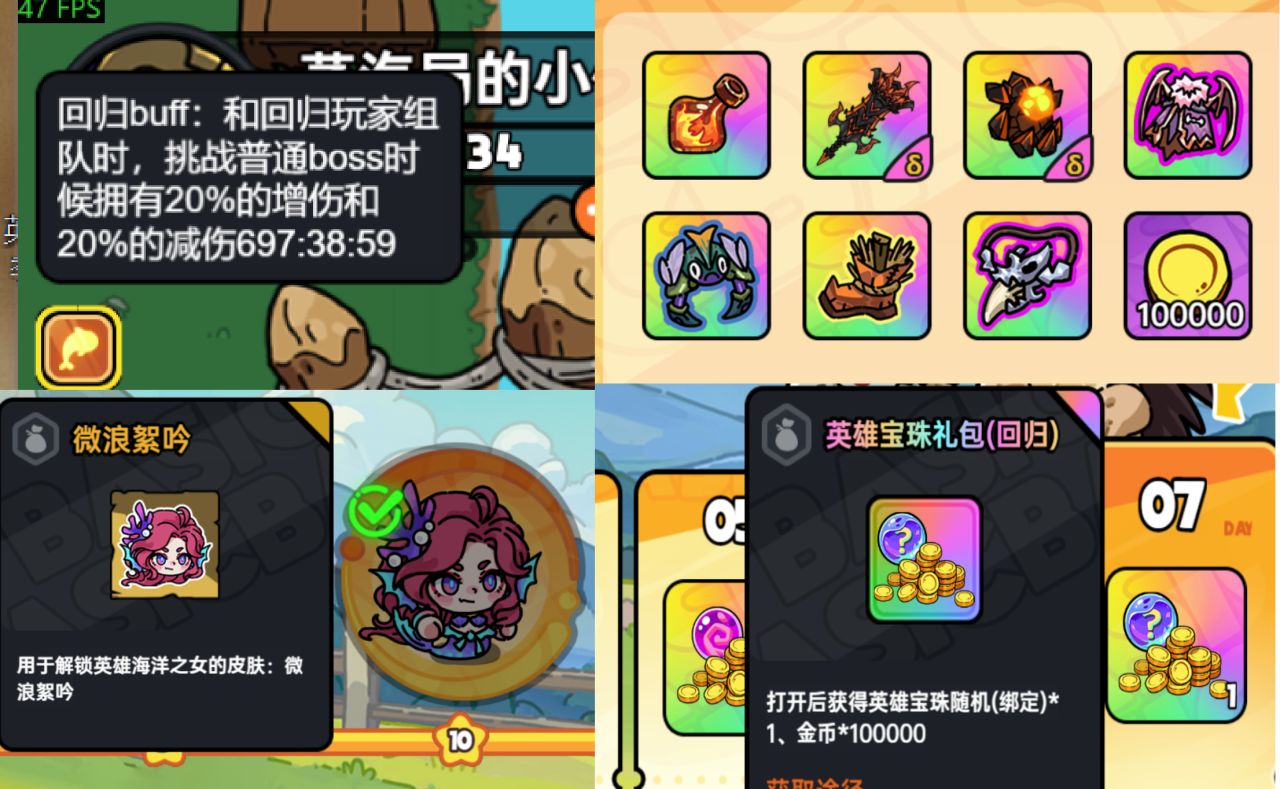 新賽季開啓,老玩家迴歸又是一堆獎勵,甚至還有個迴歸buff——和迴歸玩家組隊時,普通BOSS有20%的增傷和減傷。迴歸立領一套彩裝、7天領30w金幣(基本抽出所有英雄寵物)和鑰匙附靈卡寶珠、做迴歸任務領皮膚。
