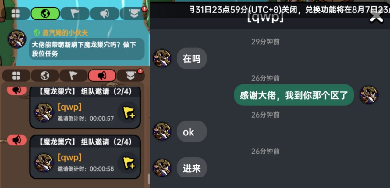 其實一開始都沒看到他的好友申請和組隊邀請(所以你可以看到組隊邀請發了很多遍),後來纔看到社交和組隊頻道的感嘆號。
