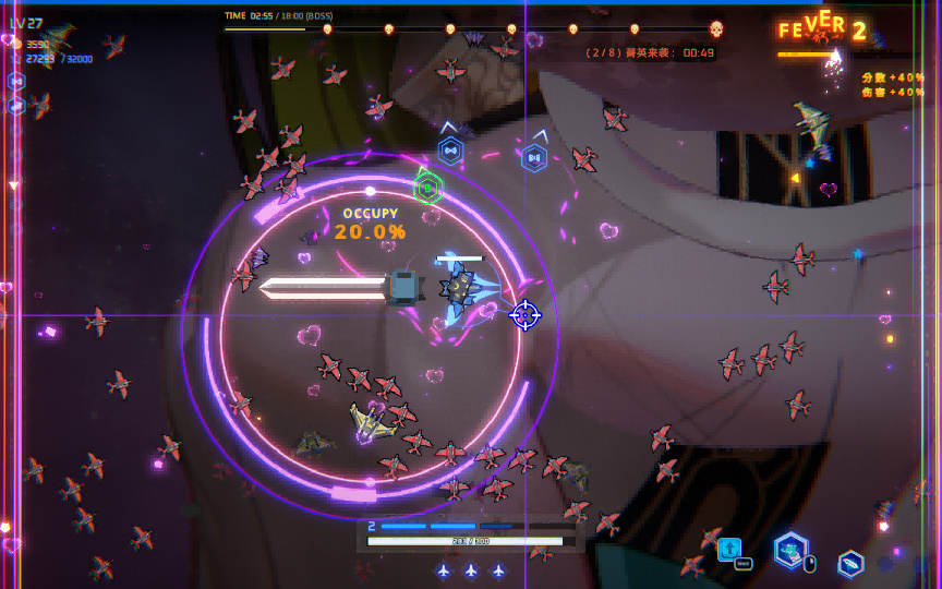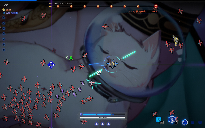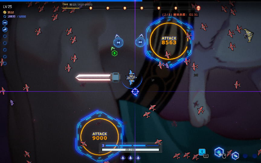 如图所示,跟吸血鬼幸存者差不多,都是武器自动战斗,你要做的是控制走位避免死亡和找角度击杀敌人并拾趣掉落的经验。上面的进度条代表每过一段时间就会有精英敌人出现。