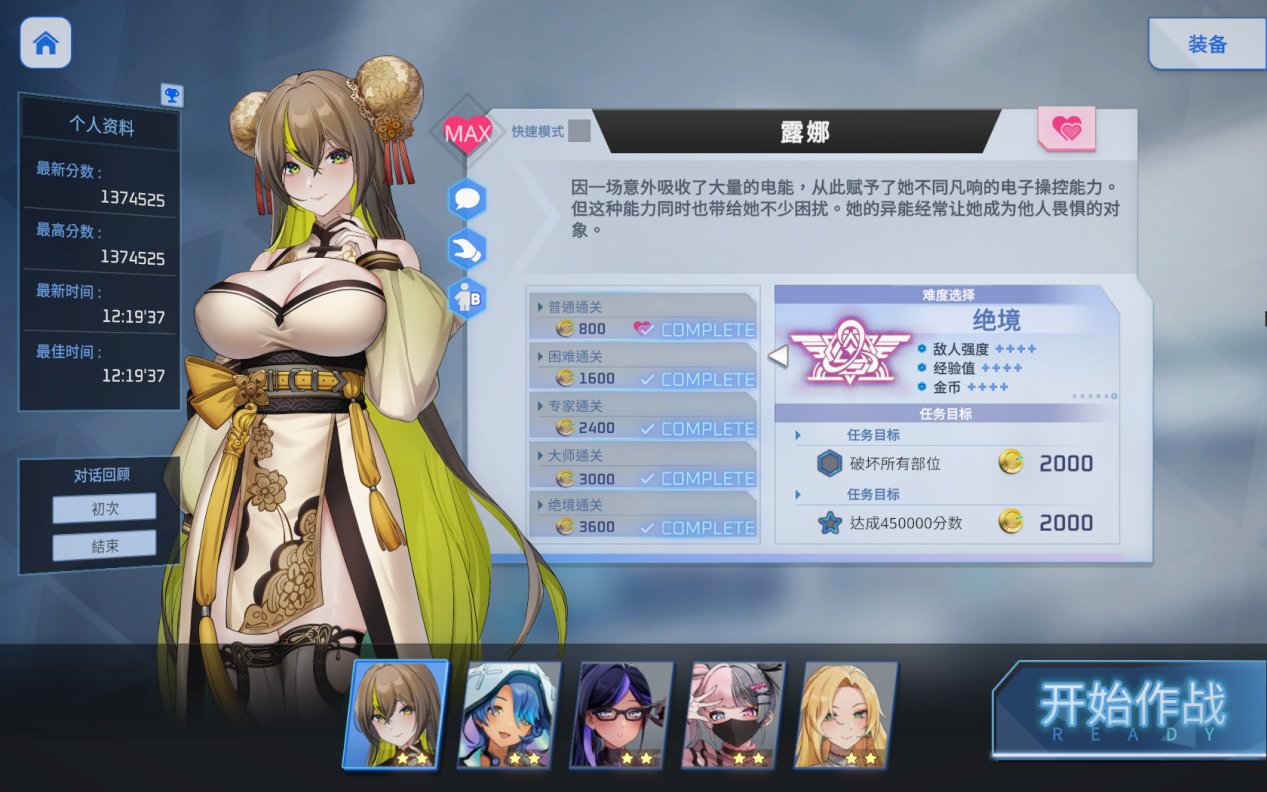 这个游戏共有五个角色,实际上是代表了五张地图,每张地图都有独特的敌人和BOSS,完成了角色对应的地图后会获得跟角色的对话次数,跟角色对话可以增加好感度,每个角色都有两套衣服,在研究室里跟猫猫购买角色的另一套衣服吧。