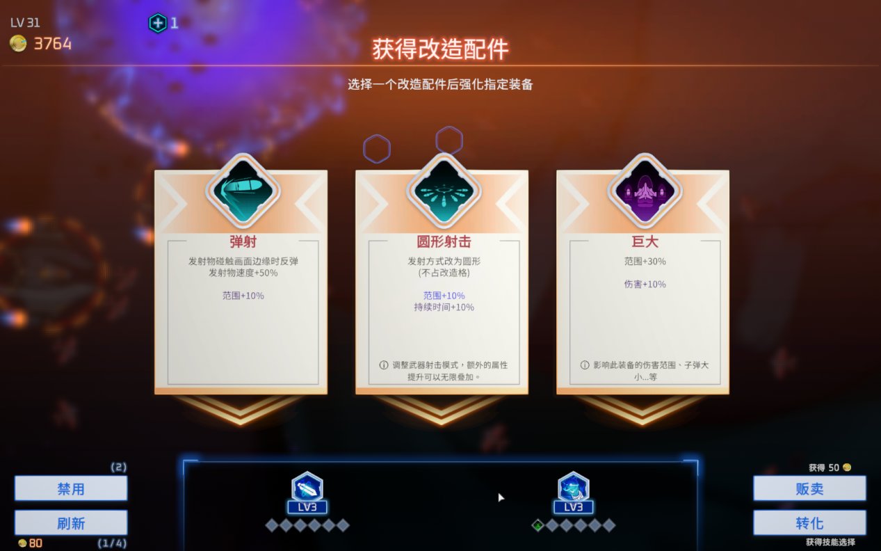 这是你打败了精英敌人之后必定掉落的改造配件选项,改造的配件会占用武器的配件槽,每把武器可以装备6个配件,如果选择三个一样的配件就会强化配件的效果(这个强化效果必须是有三个一样的配件时才存在,如果中途把三个中的任意一个删了都会失去这一效果)。