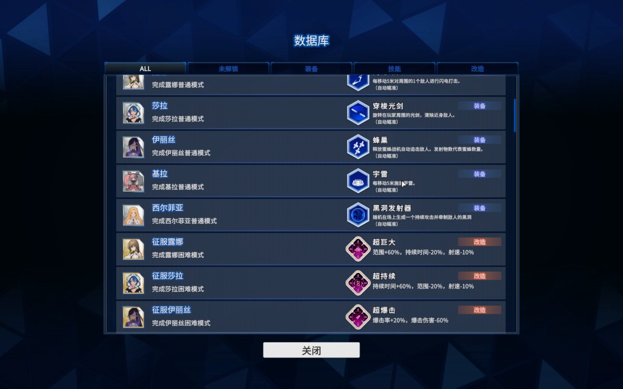 数据库相当于成就系统,完成成就可以获得新的装备、局内技能、局内改造或是金钱。