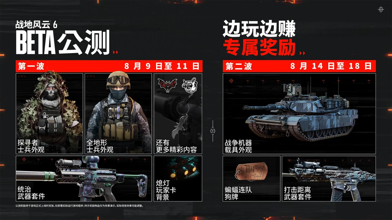 8月7日16:00至9日16:00(限“战地实验室”资格激活玩家)。公开测试第一轮为8月9日-10日,第二轮为8月14日-17日。参与公测可解锁专属士兵外观、武器套件等限定奖励。