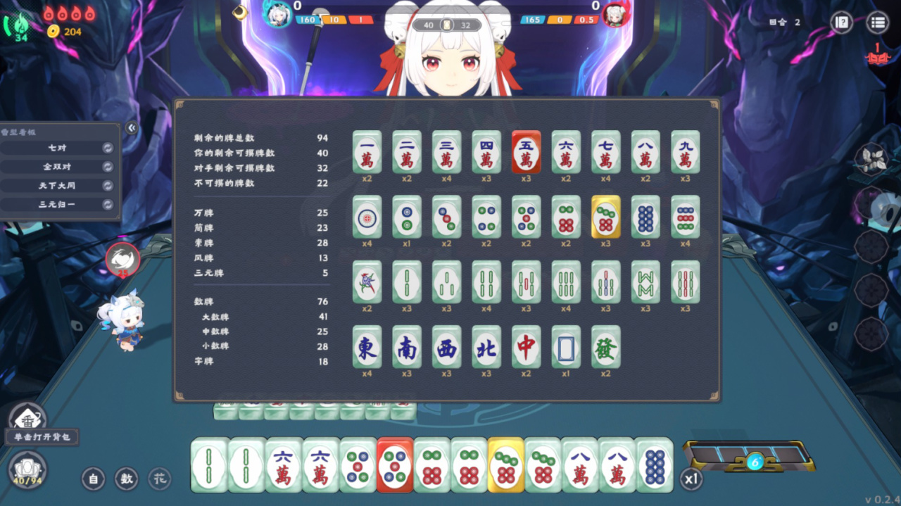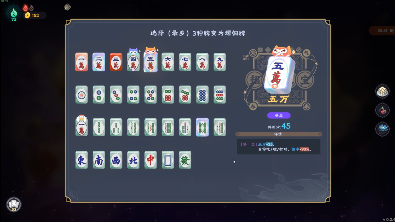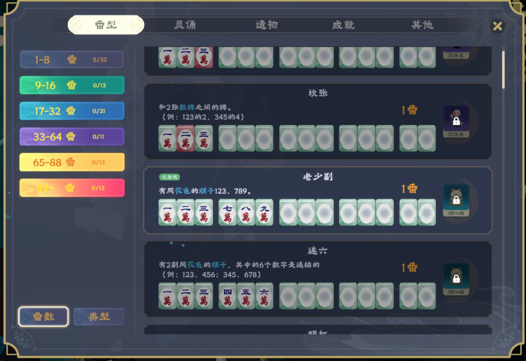 推薦番型的提示,供玩家隨時在左側參考規則進行打牌。這相當於爲你提供了一本迷你攻略,只需無腦湊番型。在聽牌時能和牌的數量越多,加上番型的基礎番數越高,再基於你的倍率受到靈俑+遺物的翻倍影響,那麼你最終的得分總值也會隨之滾滾翻倍。
