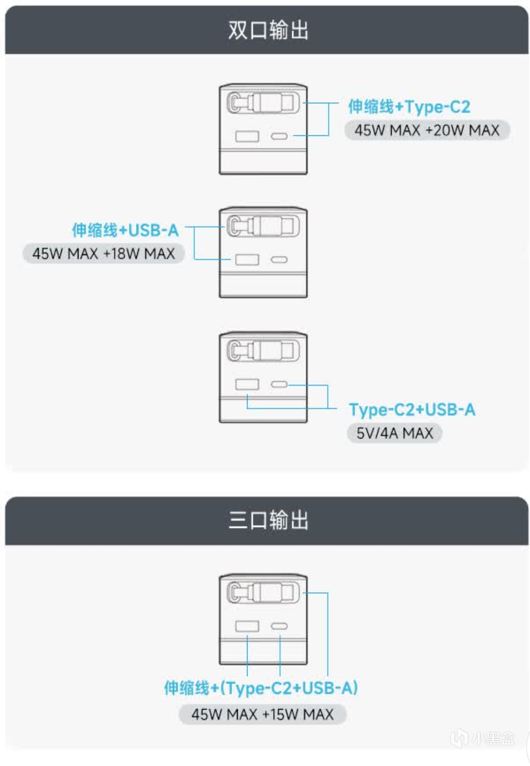 充电器自然就要讲这个输入输出效率了。单口输出的时候:C口最高支持67w,伸缩线口支持65W,A口支持22.5W。双口输出的时候:伸缩线+C口分别是45W+20W,伸缩线+A口分别是45W+18W。C口和A口的时候分别是20W。