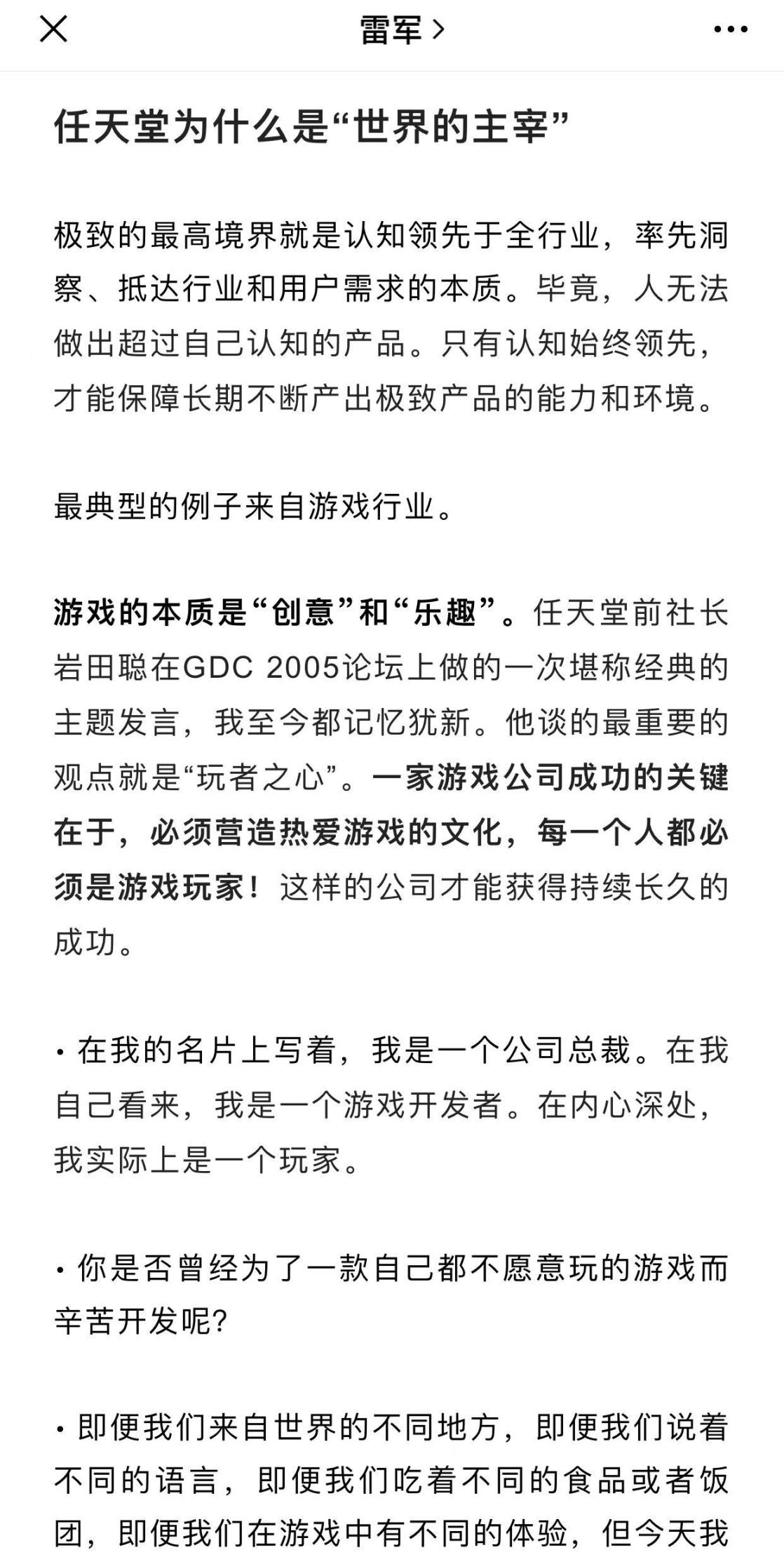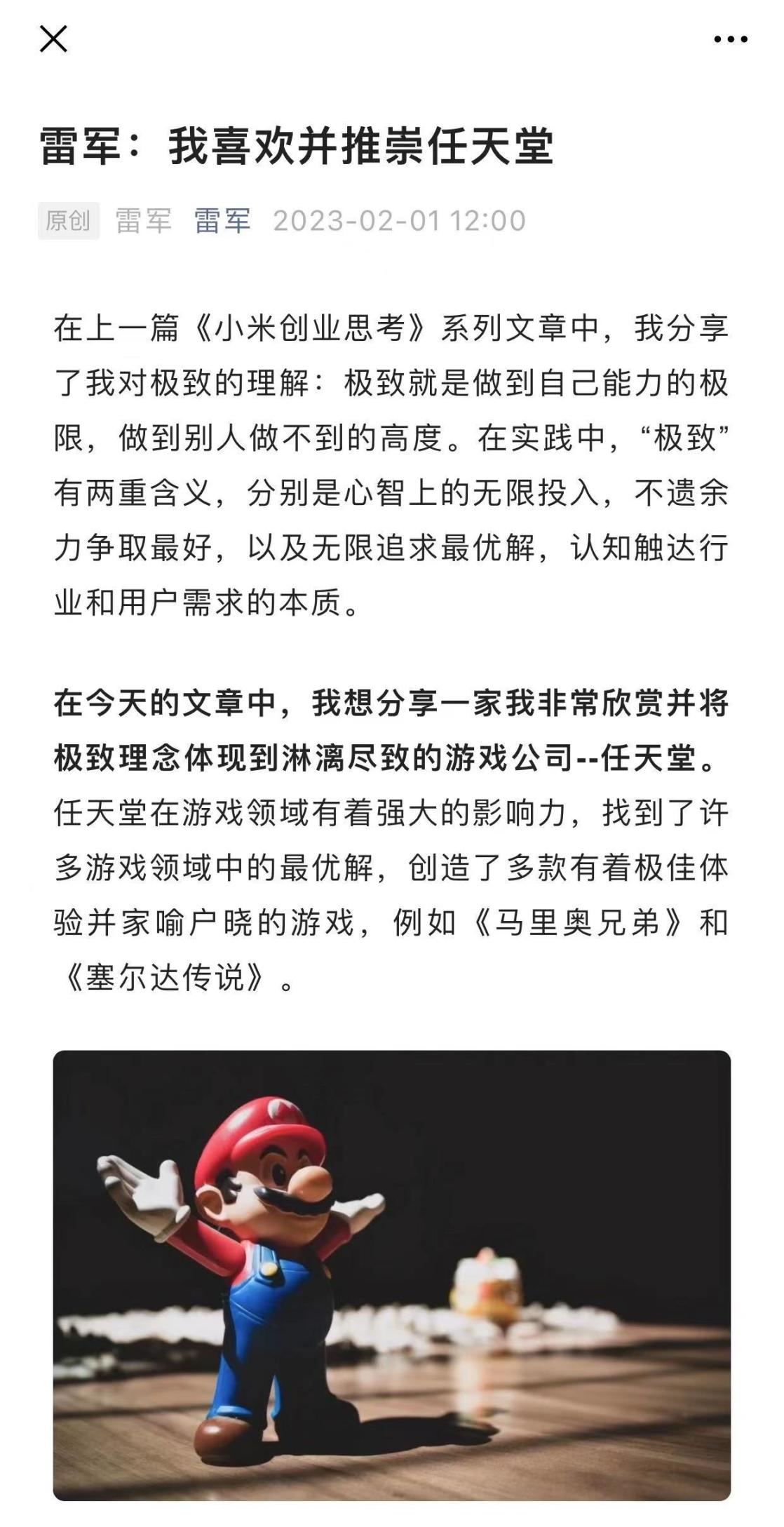 不過我今天不是專門來解釋這個梗的,而是因爲小米科技創始人雷軍,今天中午12點突然在他的個人公衆號首頁上更新了一篇文章,稱自己十分喜歡並推崇任天堂。
