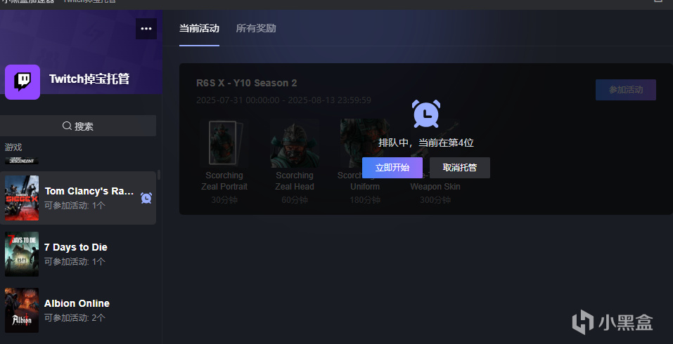 綁定完成後回到小黑盒加速器的掉寶工具,找到《彩虹六號 X》掉寶欄目,再點擊參加,就可以一鍵託管啦!還可以排隊參與別的遊戲掉寶活動哦,非常方便!