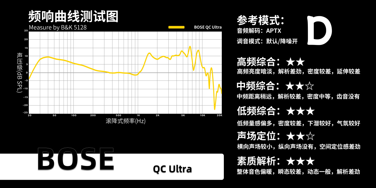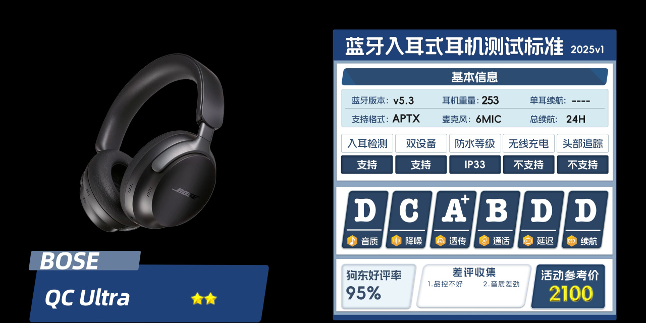 然后是BOSE的QC Ultra,作为降噪耳机的开山级品牌,降噪表现全场最差,做工质感不如小几百的机型,声音听感闷糊一团,续航延迟通话表现也是拉跨,除了佩戴的确舒服,真的是完完全全不推荐。