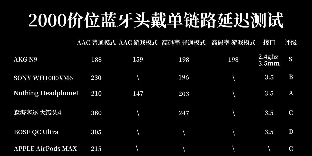 旗舰头戴这边可能是面向受众不一样,并没有很重视延迟方面的优化和性能,只有带2.4Ghz的N9算是低延迟无线,以及Nothing在低延迟模式下勉强及格,别的都在200毫秒开外,对于竞技类游戏存在明显延迟感和影响,只能插线使用,对延迟有要求的游戏玩家要注意这点。