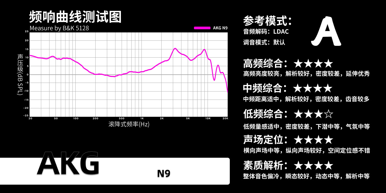 AKG N9的高频稍亮,有紧涩感,高频解析较为出色,乐器线条感凸出,不过质感比较发虚和碎,擦片过于凸出。高频延伸不错,泛音丰富。中频距离适中,解析较为不错,人声口型与乐器结像能够还原且分离。密度一般,人声的气声重,胸声薄,有明显的颗粒粗糙感和发飘感,齿音略微明显和刺激。低频量感适中,解析较差,鼓声质感不够饱满发脆,下潜还行动态感有。横向声场中等,纵向声场较为不错,定位感和分离度表现不错。总的来说,N9比较适合用来听一些日系流行女声以及室内编制乐。