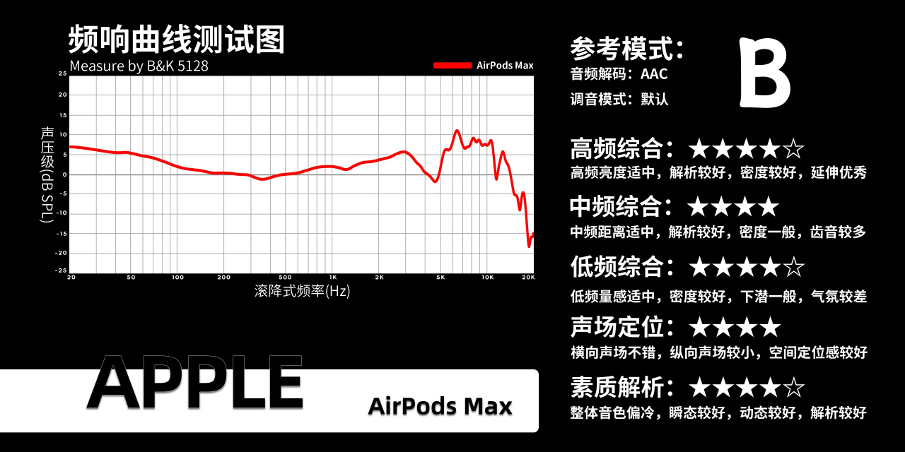 AirPods Max的高频明亮,解析优秀,弦乐结像较为清晰,线条感略微凸出,密度不错,延伸很好泛音丰富,对弦乐器能够很不错的表现。中频较为贴耳,解析优秀,人声口型和乐器解析清晰,不过由于高频存在感略高导致中频质感稍微有颗粒粗糙感,齿音和擦片较为凸出和刺激。低频量感适中,解析一般,声音中下盘容易混作一团,不过质感还行,鼓声比较饱满扎实有力,低频下潜不错,声音的动态感和低鼓的击喉感都能不错的表现,声场空间感优秀。APM的声音听感走了个偏两头翘的风格,素质解析不错,不过高频会比较刺激和薄亮,比较适合摇滚乐和编制乐的表现。