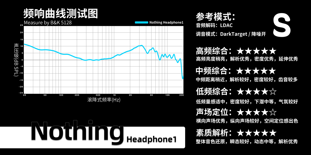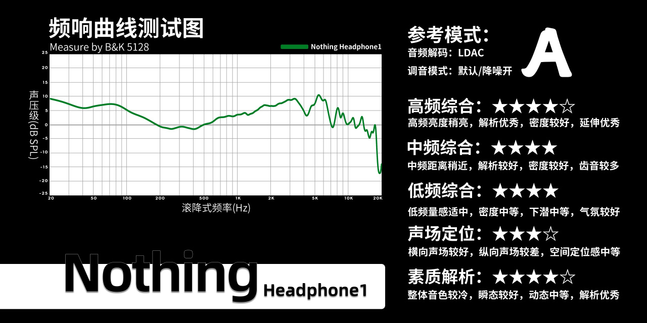 Nothing Headphone1的高频亮度稍亮有锐利感,解析优秀,乐器的结像清晰,线条感较强,能够很好的分离。延伸优秀,泛音较为丰富,弦乐音色优美,很适合用来欣赏小编制室内乐。中频人声较为贴耳,解析优秀,对于人声口型以及乐器细节能够较为清晰的还原,因为高频峰的存在,质感稍微有些薄和呲。人声会稍有年轻化,气声稍微突出,不过齿音控制不错。低频量感稍少,解析不错,鼓声的轮廓线条较为清晰,贝斯和低鼓能够干净表现和分离,不过质感稍显薄脆,不够凝实饱满。低频下潜稍差,动态感稍显疲软和底鼓击喉感较浅。横向声场较好,纵向声场拉不开距离,声场稍有山洞音感,声音的分离度和定位感还不错。总的来说,是个均衡偏突出解析感的调音思路。