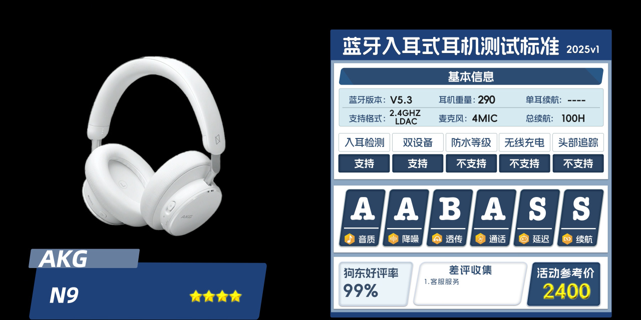 其次我会比较推荐AKG N9,熟悉我的同学应该知道在之前的大促推荐里我已经推荐过多次,这次横评对比下来的性能也不让人失望,综合表现十分出色,声音素质解析不差,不过高频略多了些需要稍微压压,2.4ghz的低延迟无线连接可以说是游戏用户特攻,2000左右能够拿下的话,值得推荐。