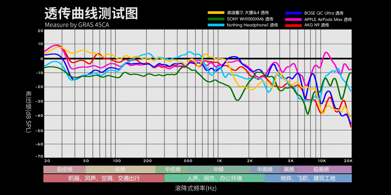 然后是透传方面,不用多说APPLE在这方面是绝对的王者,BOSE在这环上稍微扳回一城,算是位居第二。N9在3000hz附近才出现明显衰减,表现也还不错。XM6的策略比较特别,透传效果虽然稍差,不过自然度很高。剩下的来说,大馒头4和Nothing在低频附近有较为明显的反向增噪,可能会产生一些不自然感。