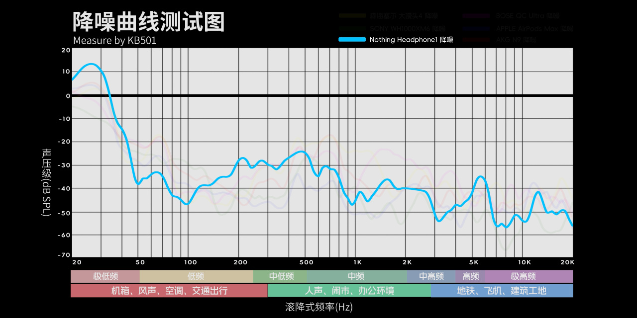 其次是nothing headphones,33.5的平均降噪表现仅次于前面两款,这款的中高频降噪稍逊,且出现了少许的反向增噪,不过没有像前俩个由于佩戴导致降噪不稳定的情况,综合降噪体验也在前列,对降噪有要求的同学非常推荐。