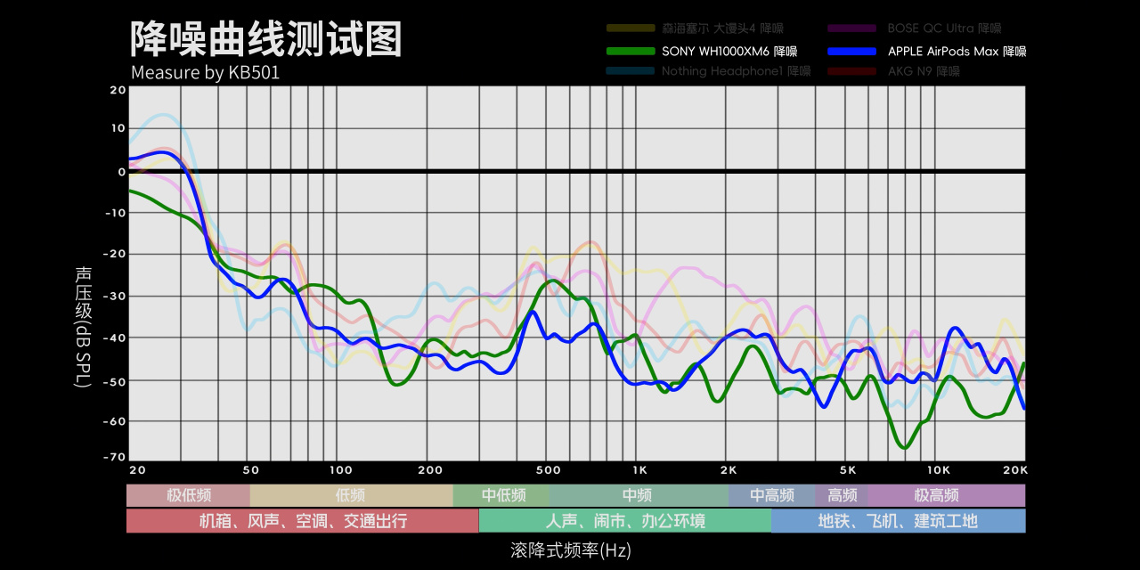 降噪第一梯队自然是苹果和索尼这两大巨头,35db的平均降噪和别的机型可以说明显拉开了差距,苹果基于自研的芯片以及算法,在中低频的主动降噪上遥遥领先,索尼则基于腔体结构设计所带来的优秀被动中高频降噪同样站在降噪之巅上,不过实际体验中这俩一个过于夹头导致佩戴难受,一个耳罩下方不够贴合非常容易漏气,很容易达不到测量中那么优秀的表现。