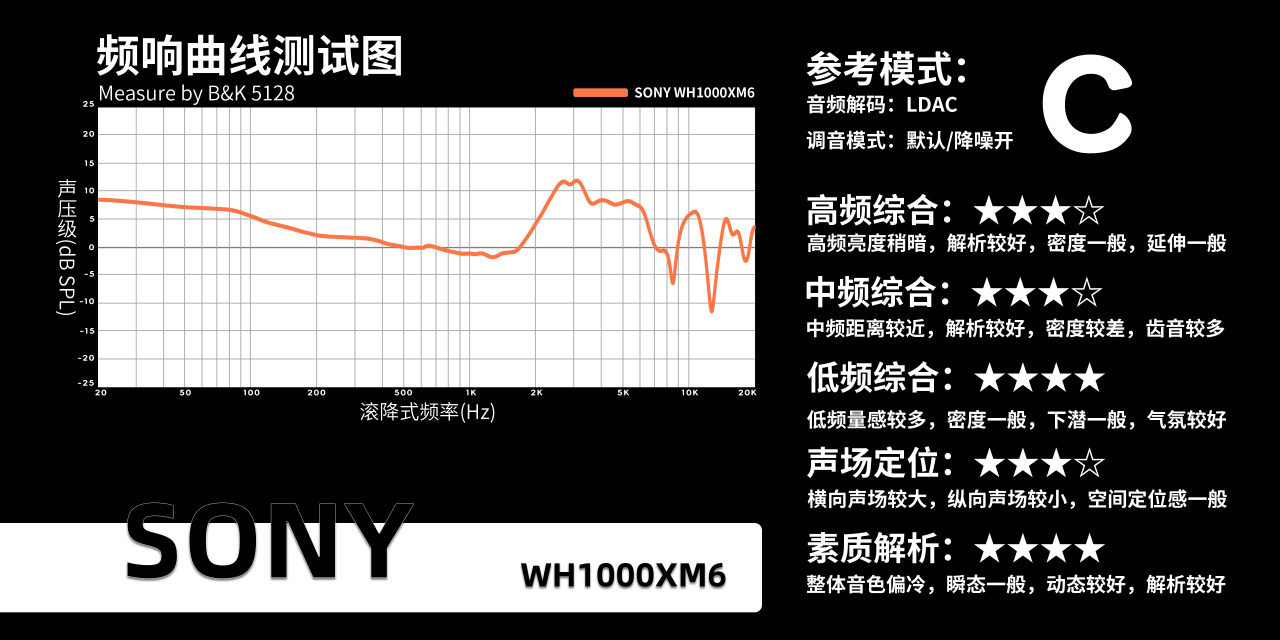 WH1000XM6的高频稍显暗淡,解析不错但乐器线条感有点过于凸出,中高频扬升有压抑感,极高频延伸出色。人声距离较近,口型偏大解析不错,但由于高频峰的存在使得质感较为粗糙发呲,齿音略微突兀和刺激。低频量感稍多,解析一般,鼓声和贝斯混在一起分离不开,击喉感和冲击力表现不错,极低频的动态稍弱不过也能够表现。总的来说,XM6因为高频的大谷以及极高频两个超高的峰导致听感又暗又糙,声音的自然度和完成度甚至不如五代。