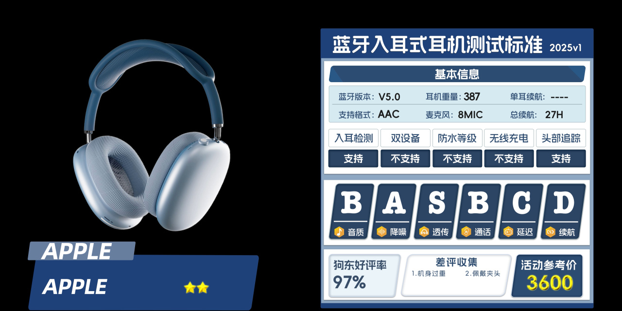 Apple Airpods Max,时隔快五年了还不换代,声音听感冷薄刺,降噪理论很好实际佩戴会漏音,佩戴又重又夹,人体工学依托,续航低,延迟高,售价还是这次测评里最高的,一台能买人两台,不知道苹果去年为什么还不更新这个老古董