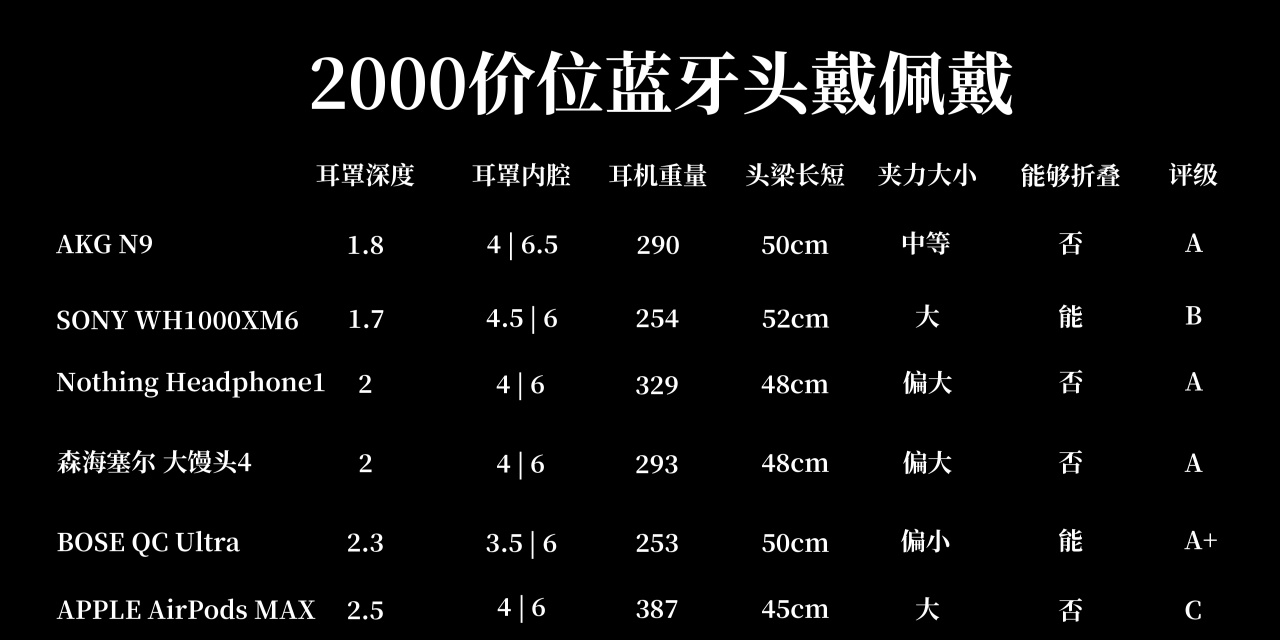 就我的个人实际体验来说,BOSE QC Ultra的佩戴是最为舒适的。耳罩腔内容积很大不会有触碰到内壁的异物感,而且夹持力较小的同时能够很完美的包裹住耳朵,好评。AKG,nothing,森海的佩戴就会稍逊一些,N9的腔内体积略小,导致耳廓还是会碰到腔体内部。Nothing的夹持力略大,加上稍硬的耳罩会略微不适。木馒头4也是夹力大,虽然耳罩软但是腔体不够深,很容易压扁耳罩使得耳朵触碰到内壁。XM6就要更差一些了,耳罩浅,夹力强,耳朵很容易就触碰到内部结构产生不适感,只能说为了被动降噪在佩戴上做出了很多的妥协。至于AirPodsMAX,首先是超高校级的重,近400克的重量比这次测评的另外几款耳机平均重了三成。然后是,即便把头梁拉倒最大也是爆炸级的夹,而且受力不均,上面部分明显比下半部分更夹头。最后是,这个织物耳罩的柔软度以及亲肤程度实在是谈不上舒适,耳罩下方还很容易出现漏气感,个人觉得这款最大也是最要命的问题就是佩戴了,严重影响体验感。