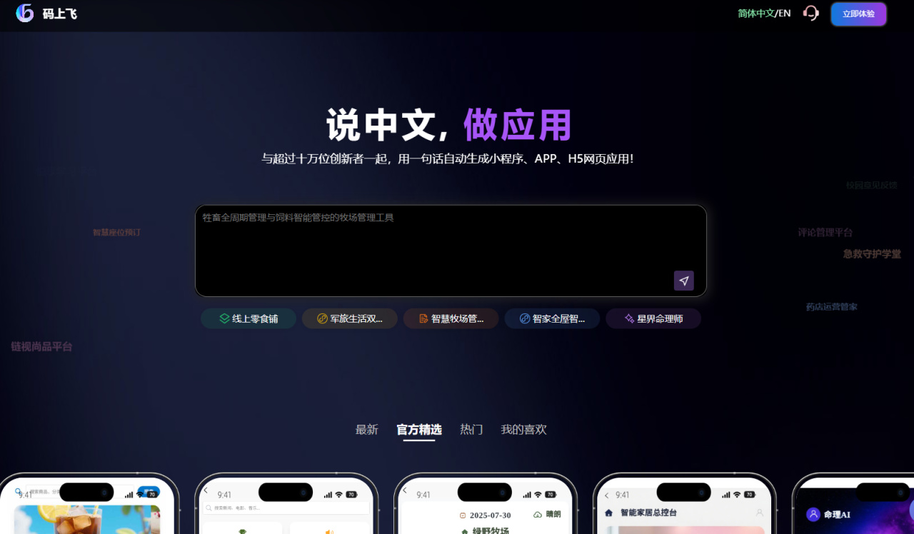 這是一個不需要寫一行代碼,只用一句話就能生成小程序APP和網站的平臺,聽起來是不是感覺很扯?直接在輸入框填寫自己的需求,比如想生成然後點發送,他就會先給我生成一份詳細的設計方案,滿意之後的全過程都由它自動完成,只需要等生成完成之後點立即體驗,預覽自己的小程序
