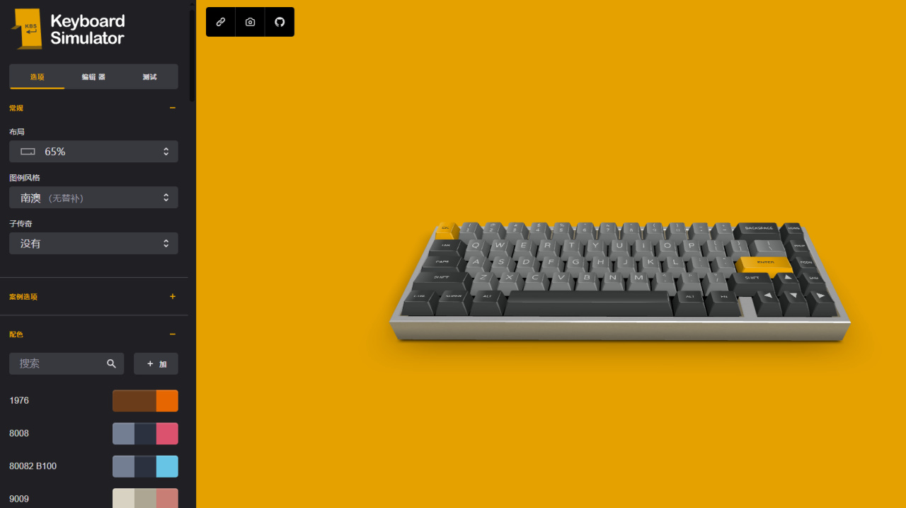 這是一個能夠讓你做出自己喜歡鍵盤的網站,在這裏面有非常多的配色,滑動鼠標就可以放大或者縮小,拖動鼠標就可以調整它的位置,並且當你在按鍵盤的時候,在上面也會同步的顯示出來,在左側可以設置各種選項