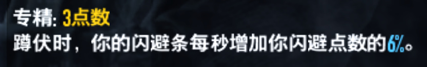 通过挨打或者闪避系技能,可以根据玩家的闪避点数来补充闪避条,也就是说,闪避点数决定的是补充多少,空有闪避点数没有补充方法也不行,图中这个技能就是补充方法——蹲伏。