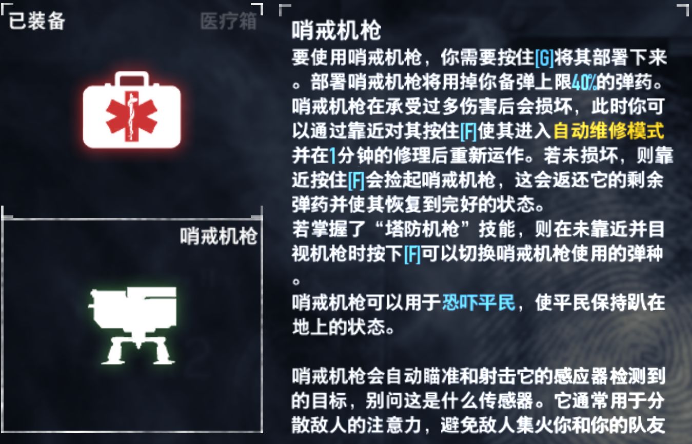 哨戒机枪炮台现在在损坏后可以维修了,潜入中还可以用来控制平民。
