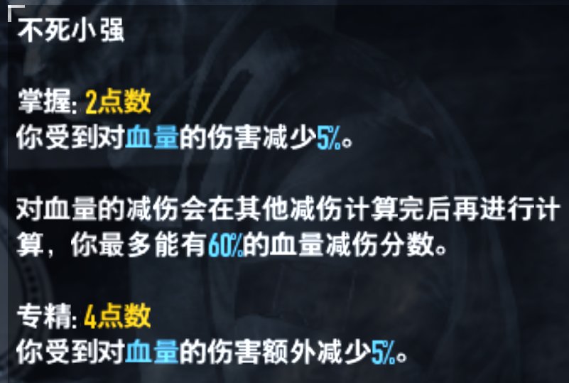 这个数值可以通过技能或者护甲等获得,其效果也是字面上的意思,减少你受到的对血量造成的伤害。这个效果同样适用于幻影特工把你踢倒或者泰瑟警察把你电倒的情况,如果你有20%的血量减伤分数,你被踢倒或者电倒扣的血量就会减少20%。