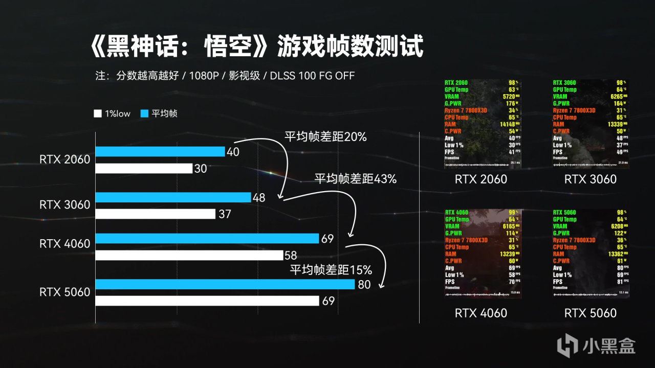 而来到了去年很火的一款国产3A游戏,黑神话悟空中,1080P影视级画质下,5060获得了80的平均帧数以及69的1%Low帧。