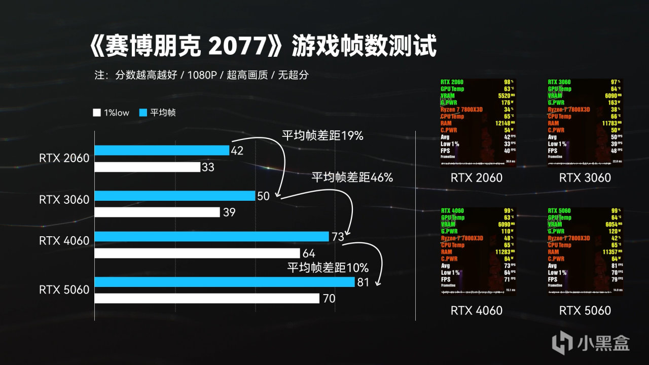 四张显卡的代级提升,除了5060在平均帧上的差距是12%左右,其他两张显卡都表现出了不错的提升幅度。