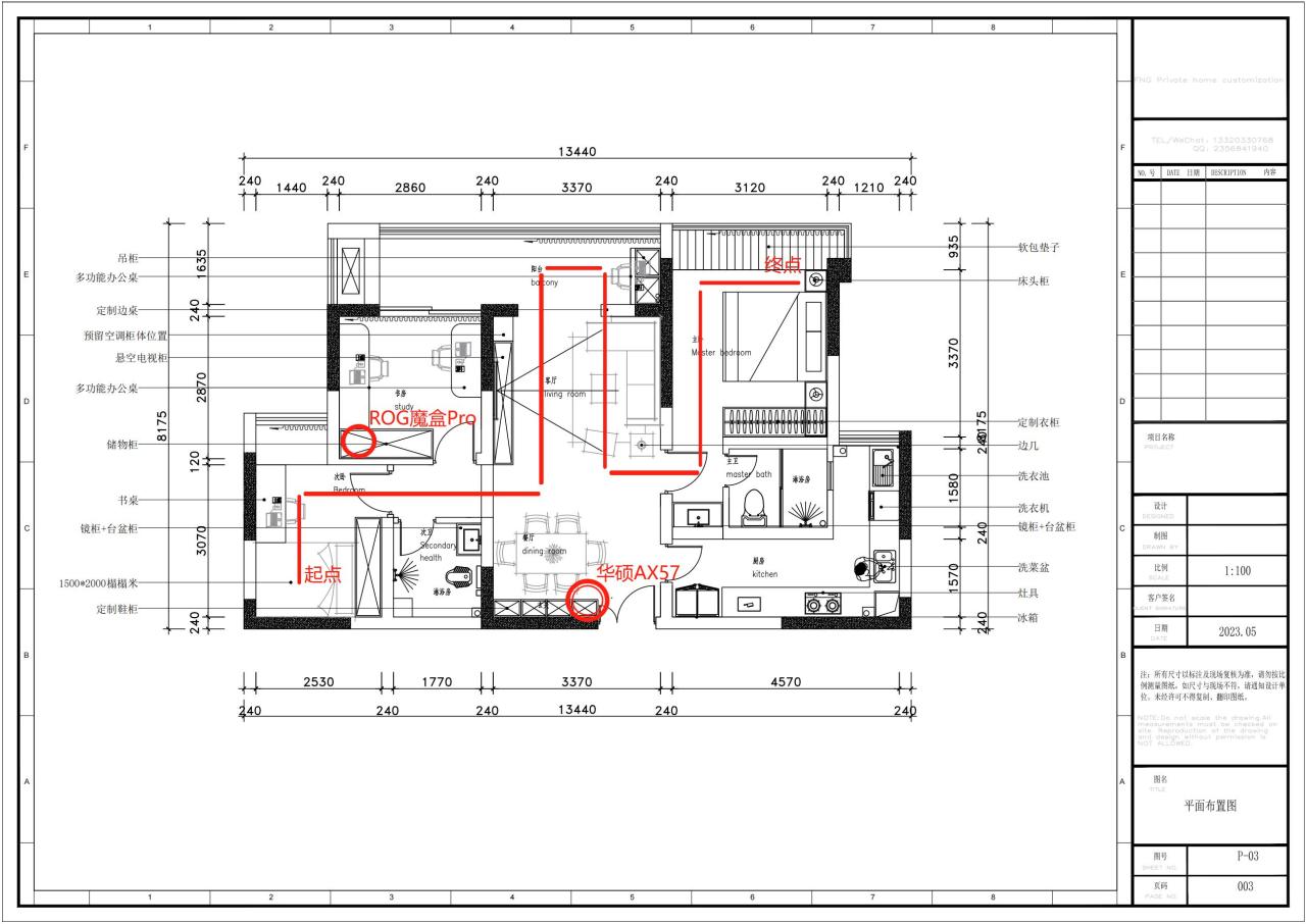 以上是我家中的户型图,总面积是101平米,承重墙(加黑加粗)的位置已经标注,ROG魔盒Pro放在我的书房,因为我需要把它作为交换机使用,同时我在客厅玄关位置放置了一台RT-AX57作为副mesh节点,注意是无线Mesh。
