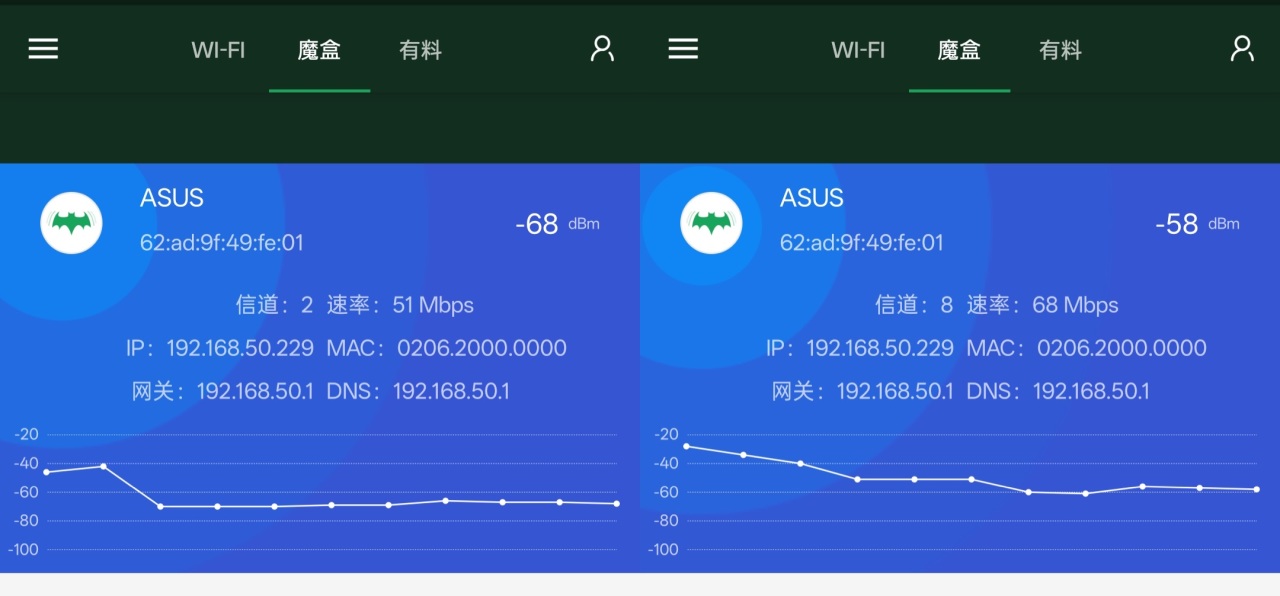 实测100㎡户型:路由器在书房位置,在间隔个承重墙的主卧最里侧,原信号强度-68dBm,切换后跃升至-58dBm,该方法实行后,大平层无死角覆盖不是梦。