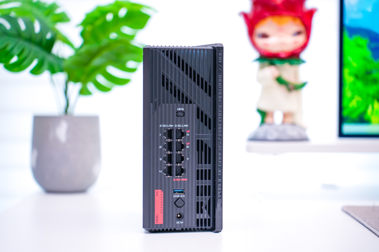 魔盒Pro的接口和按钮都在机身背部,包含8个2.5G网口、USB接口、WPS开关和DC电源接口,其中有ROG眼睛标志的5和6口为电竞端口,电竞端口是什么意思?简单来说,就是2.5G 物理速率 + 芯片级游戏封包插队 + 零配置即插即优先。
