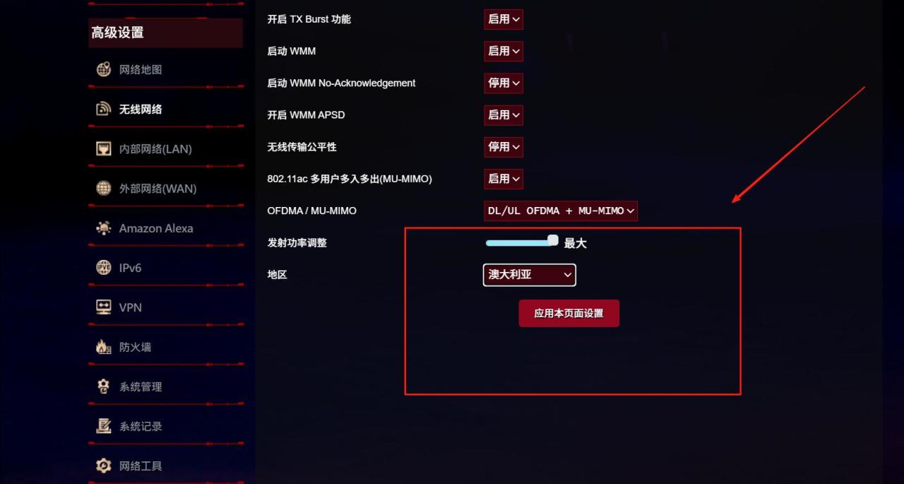 华硕为规避不同国家射频功率限制,默认信号强度偏保守。切换到澳洲模式可解锁完整发射功率。