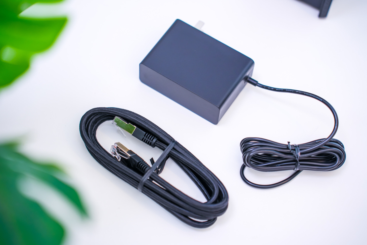 最后说说它的配件,给了一根编制CAT6网线,格调拉满,此外电源也集成到了路由器内部,外面只有一个60W电源接头,这样子就非常好走线。