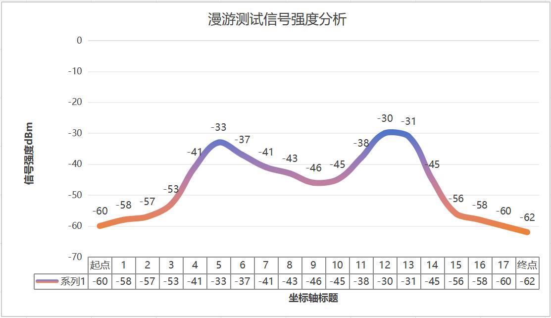 可以看到在起点位置与终点位置的信号强度最低,因为有墙和家具的阻挡,信号强度为-60dBm左右,但是这个数据已经非常优秀,属于强信号范围之内。在咱们的日常使用中,这通常代表设备处于信号覆盖极佳的位置,能提供稳定流畅的网络体验。