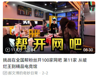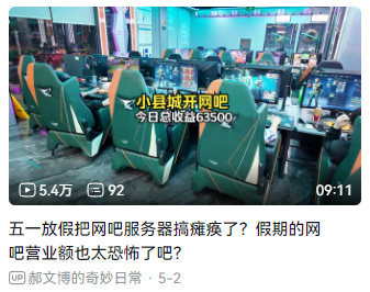 B站UP主“郝文博的奇妙日常”是河北廊坊的网吧老板,最近他的生意红火,上座率持续走高,人最多的时候座椅后面甚至还会站不少“来晚的兄弟”。他投资的几家网吧每天营业额满打满算在两万左右,淡季的时候也有一万多,如果碰上节假日,这个数字还要再翻一番。