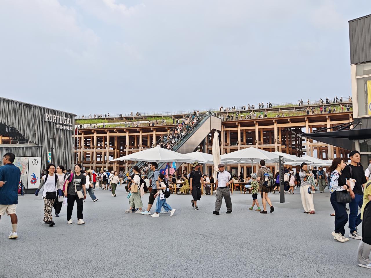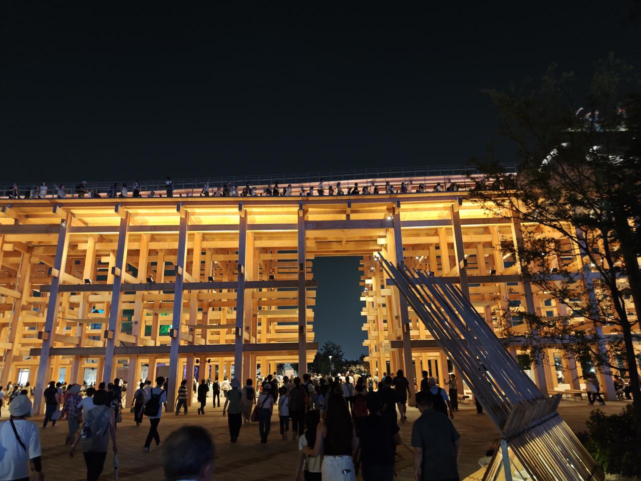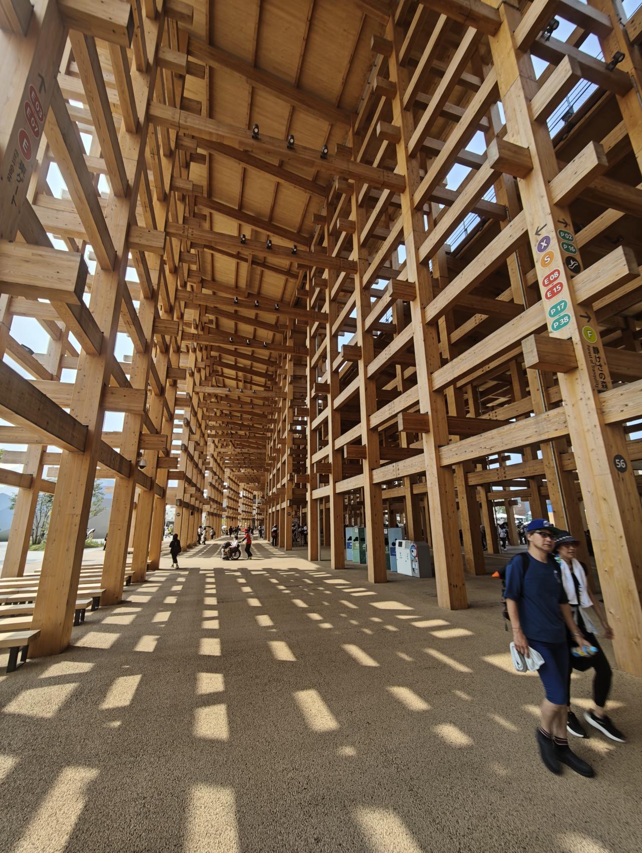 进门之后就能看到大屋根了。大屋根是本次世博会的一大特色,作为环绕整个世博会园区的大型木质结构建筑,不仅可供游客登临观赏园区,还在底下营造了一大片阴凉区域,可以用来赶路、排队和休息。