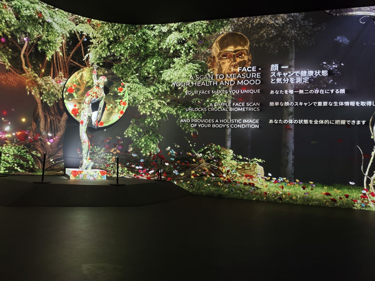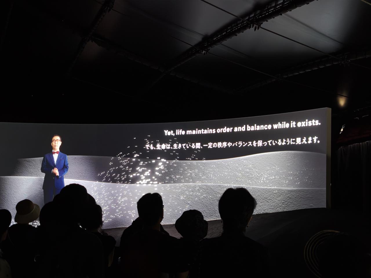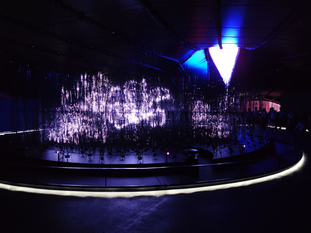 作为八个主题馆之一,仅预约。入门后扫网上流传的二维码就可以领整理券,早上的话基本能立刻排到。馆内展示15min,特色为第一部分为用数百根竖直杆子组成的电子屏,用每根杆子上的亮点来组成画面,在360°方向都可以看,第二部分则是场馆设计者生物学家福冈伸一教授,带大家探寻生命的意义。