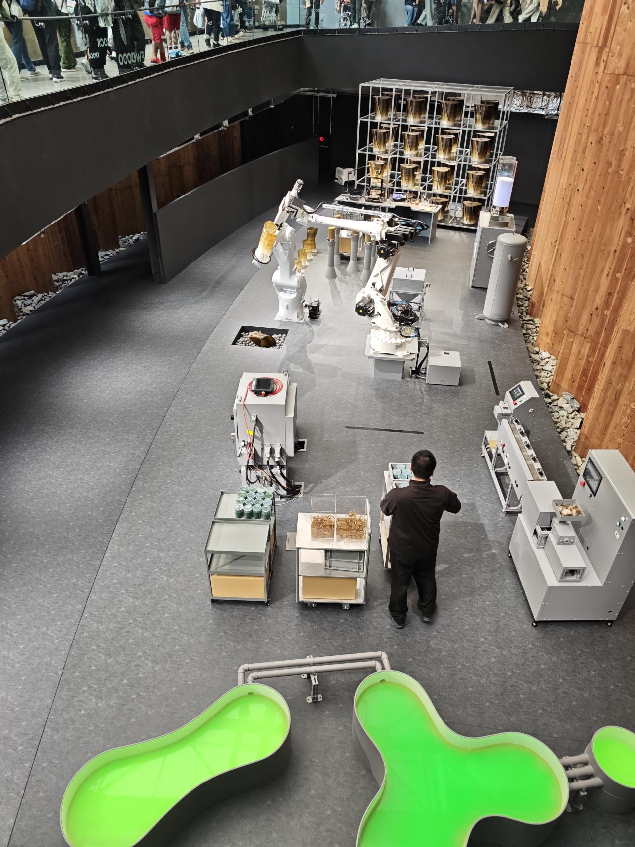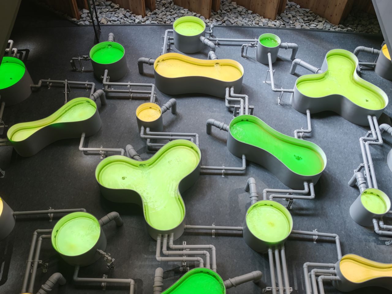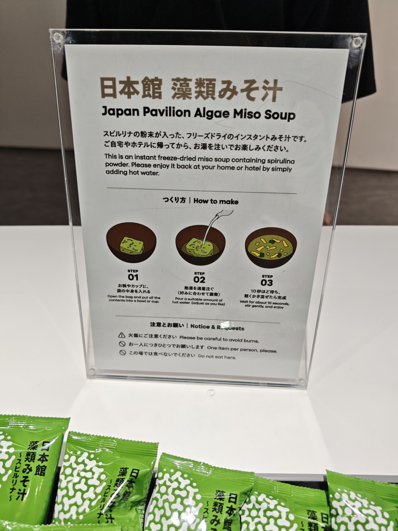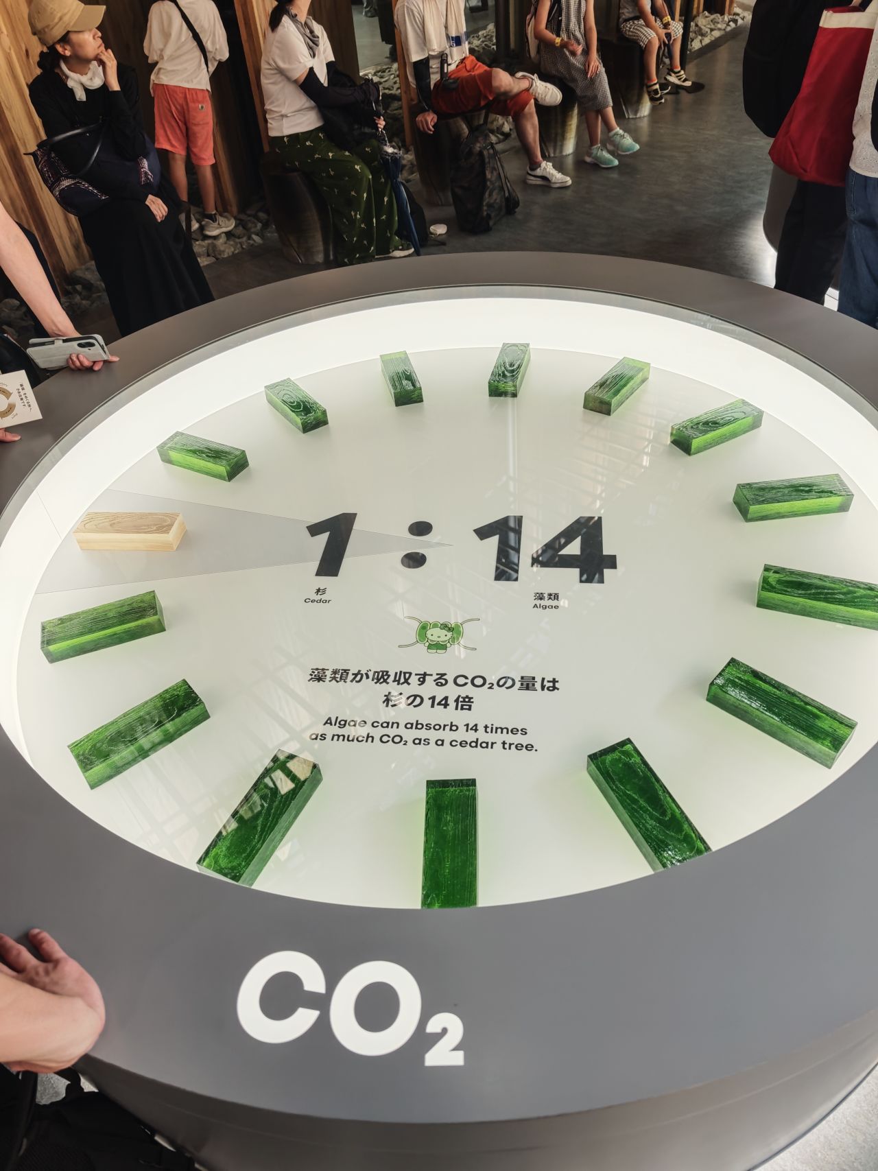 农场区展示微生物分解垃圾过程中产生的二氧化碳可以用作新材料的原料,特别展示了Hello Kitty形态的藻类以及海藻帘幕。还给每人都送了海藻味增汤