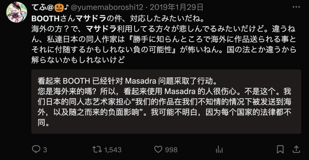 虽说网站本质是代购平台,并非倒卖,但考虑到作品流传到海外,可能会有难以预估的法律风险,进而给创作者带来「不安」的情绪,最后 BOOTH 还是屏蔽了 Masadora 的访问。