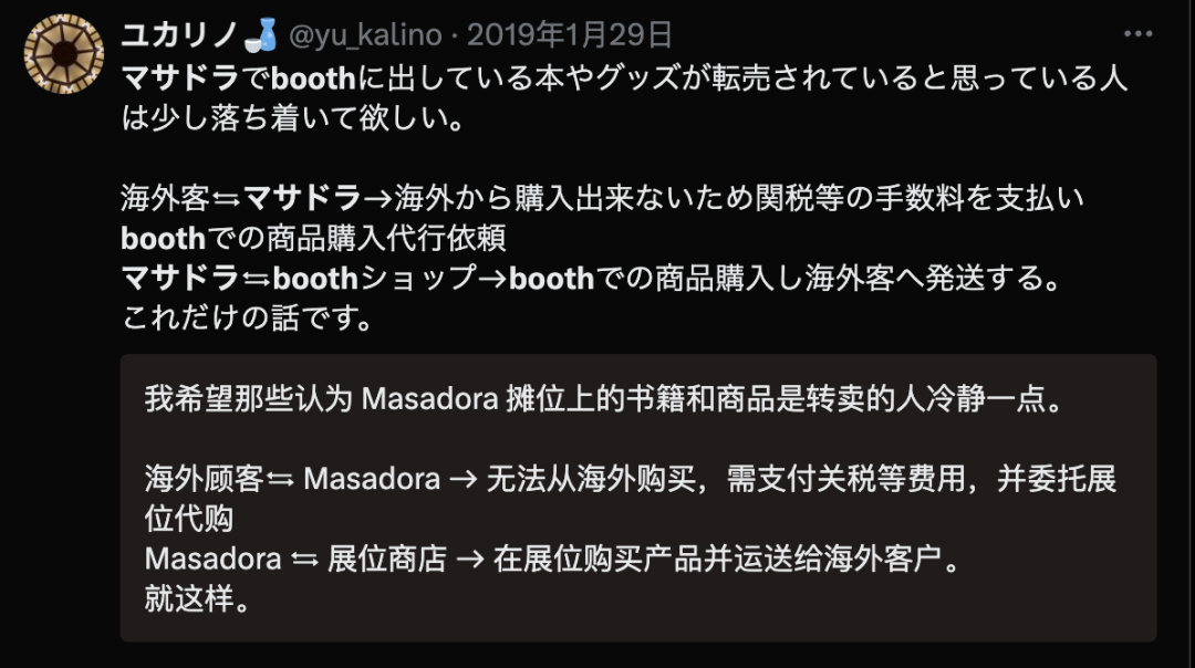 这事当时在日推闹得挺大的。搞笑的是,当时类似的代购网站有很多,甚至BOOTH自己也有针对海外用户的寄送服务,Masadora 甚至算比较良心的一个了,扒的也是网上公开的信息,不涉及隐私。