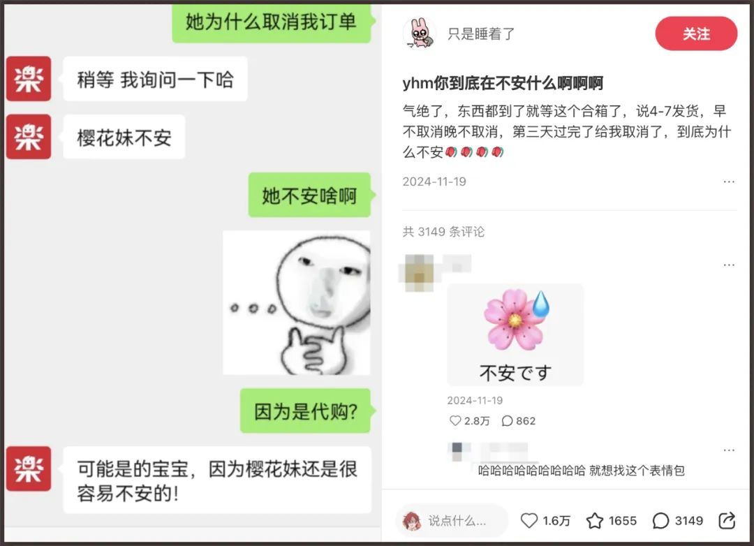 有些中国代购用的是个人号,日语够好完全无障碍交流,樱花妹发现这个中国人不好骗,起手就是一句“不安です”,怀疑对方对角色的爱,说对方是倒卖的黄牛,以“外国人让我很不安”为由取消交易。