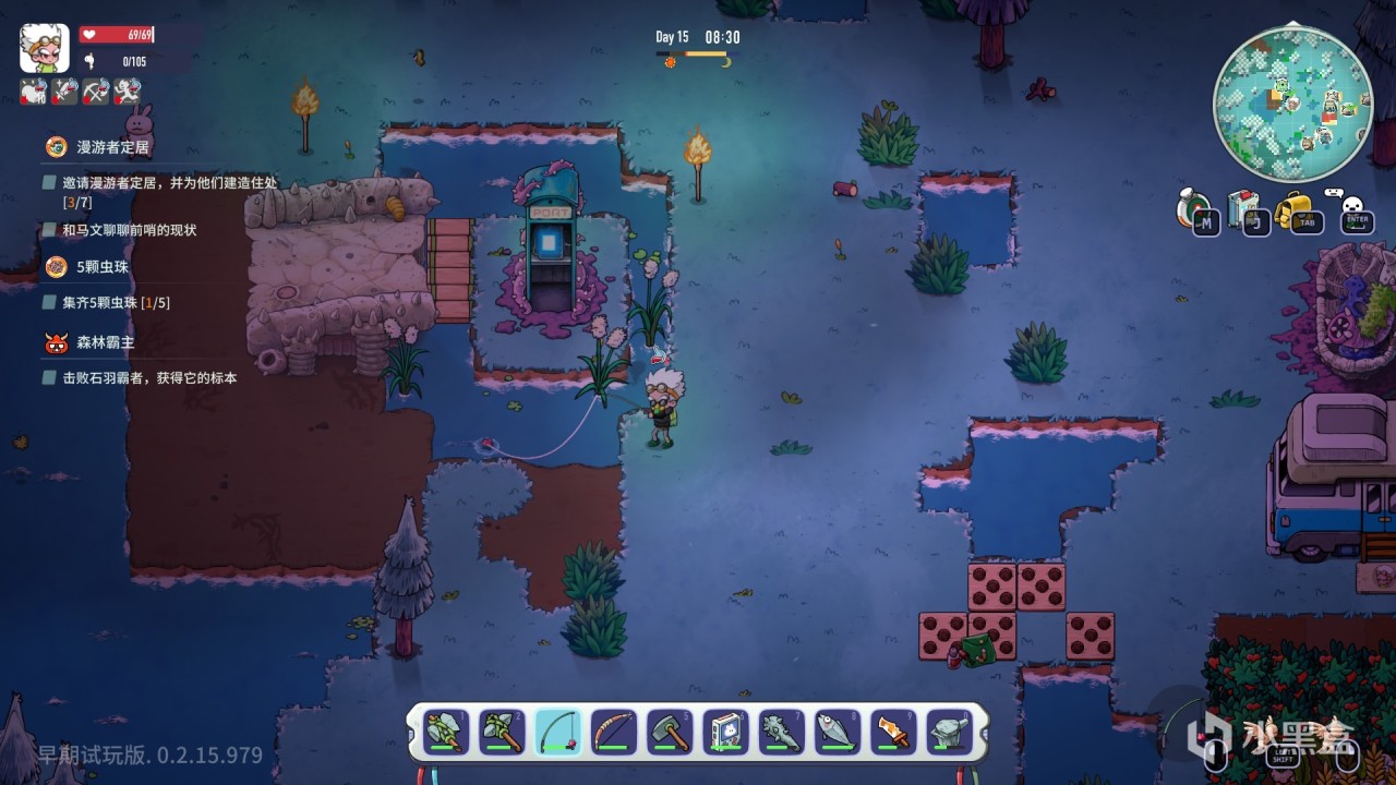 當角色裝備斧頭,就可以伐木割草;當角色裝備鎬子,就可以挖礦;當角色裝備魚竿和魚餌,就可以開始掉血……這遊戲沒有技能、熟練度等限制,只要有工具,角色就可以直接開始使用。當然,本作的工具也是有耐久的,每次使用都會消耗耐久。一旦耐久耗盡的話,這個工具就會消失。中後期的話,可以得到一些可以修復的工具,就比前期更加順心了。