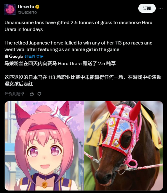其实除了这位买马的老哥,欧美马娘圈还出过一个很火很暖心的社区活动,游戏里有一个叫春乌拉拉的粉毛马娘,其原型是1996年出生的一匹枣色纯种马。